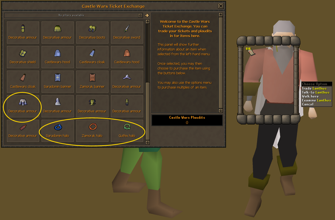 These 2 items are the best slots you can use on a pure defense account and are very easy to obtain. The Halo and Decorative Armor cost a total of 115 Castle Wars tickets, which you can get in the Castle Wars minigame, of course.