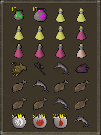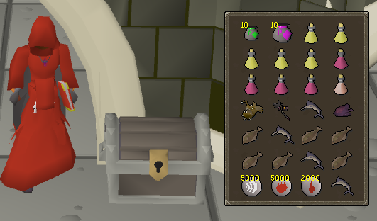 Rushing Time: Don't wear your Volatile Nightmare Staff yet; keep it in your inventory until the moment of truth (when you want to go in rushing). The special attack costs 55% energy. Eat an Anglerfish to raise your hit points, and you can enter the danger zone and attack your opponent. When you see the hit appear on your opponent and they still have low health, you can try to finish them off with a Fire Surge Spell (if the special attack doesn't kill them first).