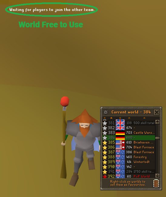 Once we have both accounts ready in Castle Wars, we need to make sure no one else is in the minigame, or we'll crash both their game and ours later on. When it says "Waiting players to join the other team," it means there's an empty world, and we can bring our other account in.
