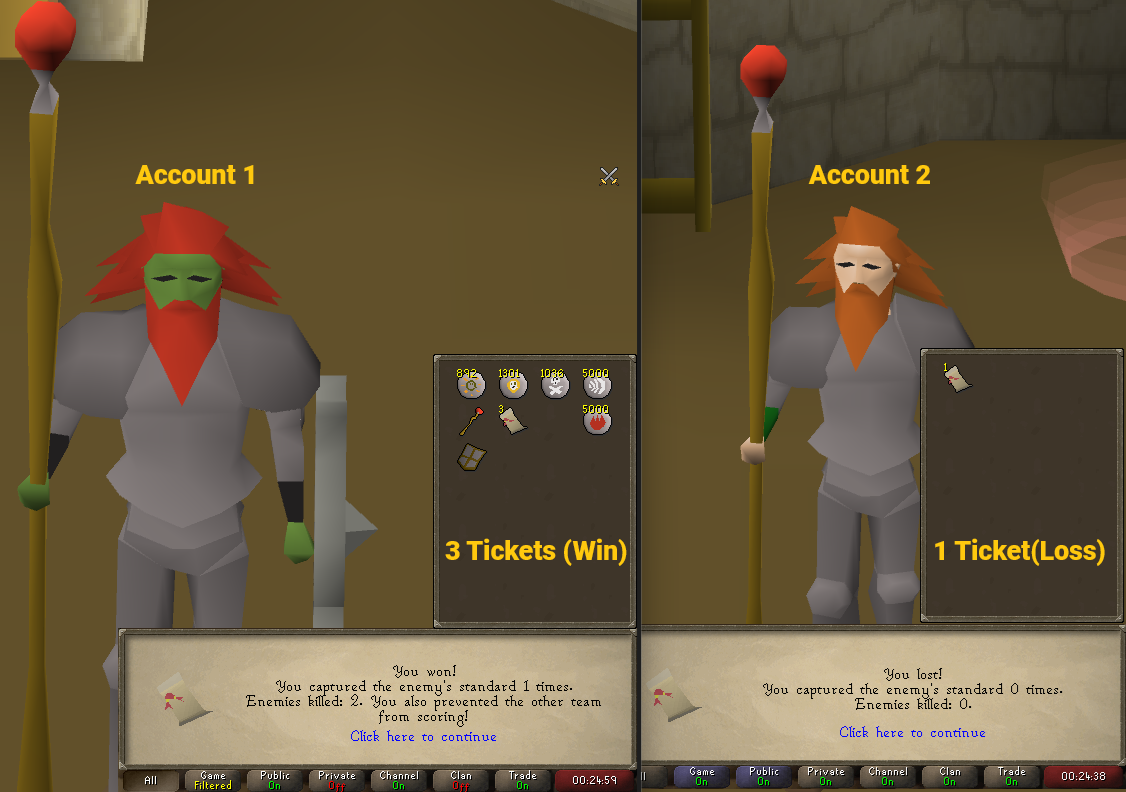 To begin, we will need 2 accounts: the account where you want to get the most tickets per hour possible, and the alt account, which can be a newly created level 3 account. Currently, there are no requirements to enter Castle Wars.