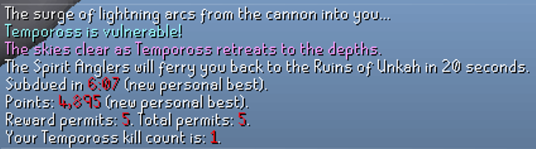 Once Tempoross’s hitpoints hits 0%, the fight ends.