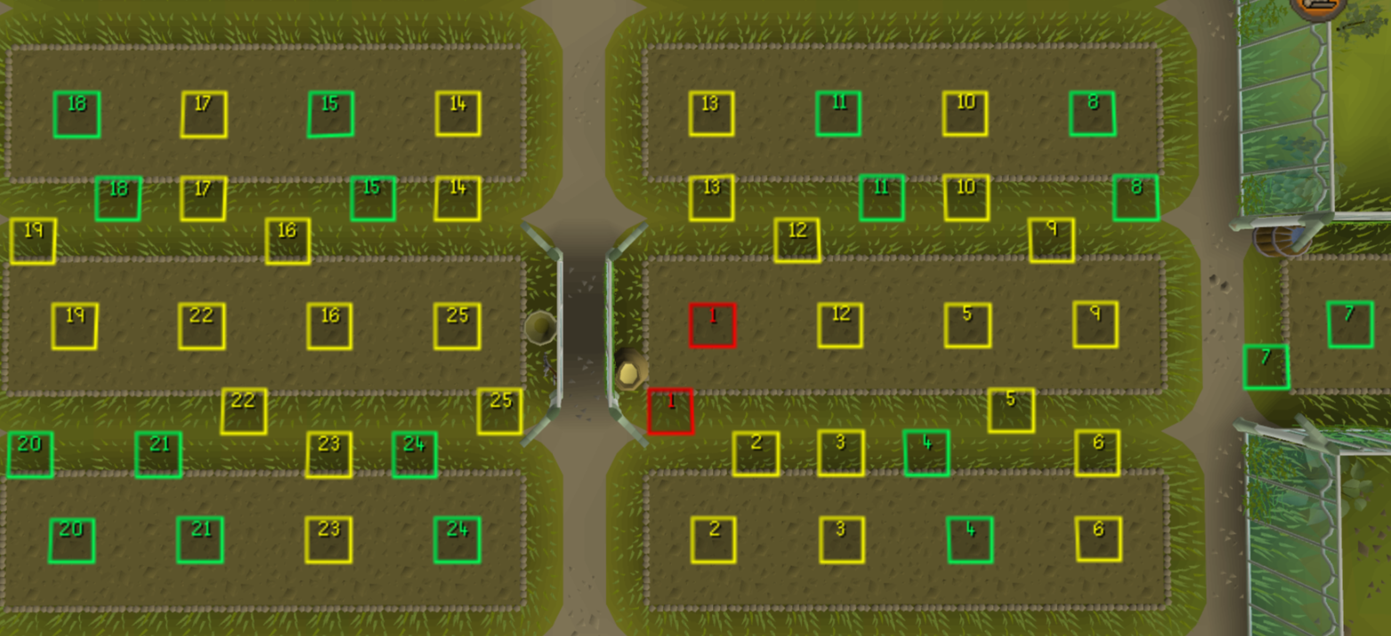 Enable Tithe Farm Helper and Ground Markers to track timers and patch layouts.