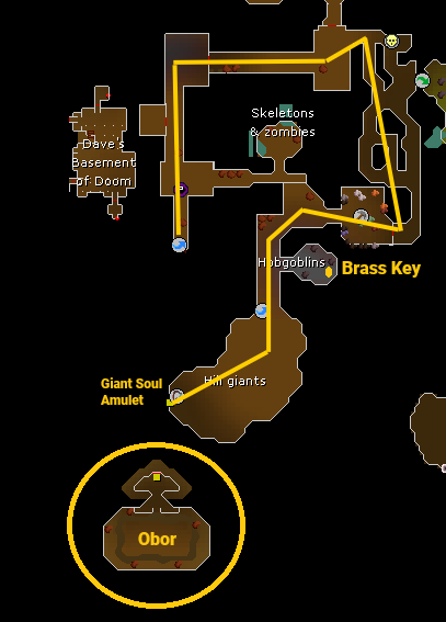 A Giant key is required to access Obor's lair, and you must always collect a fresh one any time you want to fight Obor. Obor can be found residing in his lair, which is accessible through the closed gates on the edgeville dungeon's western wall of the hill giant area.