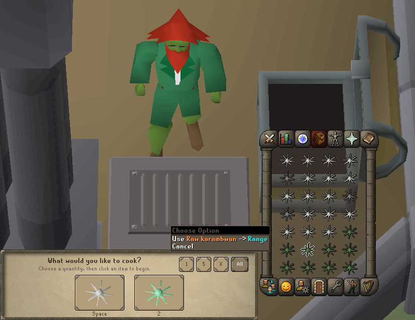 To 1 tick cook Karambwans, players need to hold down 1 or space and quickly use the raw karambwans on a range; this requires accuracy and is quite click-intensive. Alternative methods have been listed below if using this method to 99 is too challenging for you.