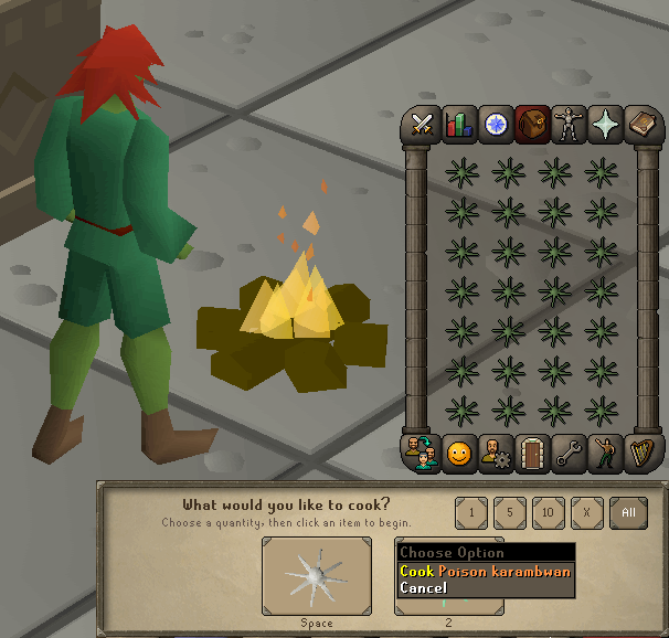 1-Tick cooking raw Karambwans into poison Karambwans is quite expensive and is not worth it for most players; however, it is the fastest method of training cooking between levels 1 to 30. 1-Tick cooking raw Karambwans into poison Karambwans is done by holding, doing 2, and rapidly using the raw Karambwans on a range.