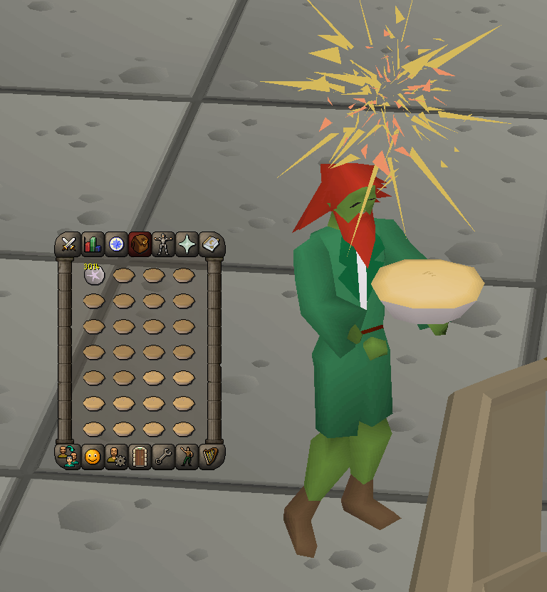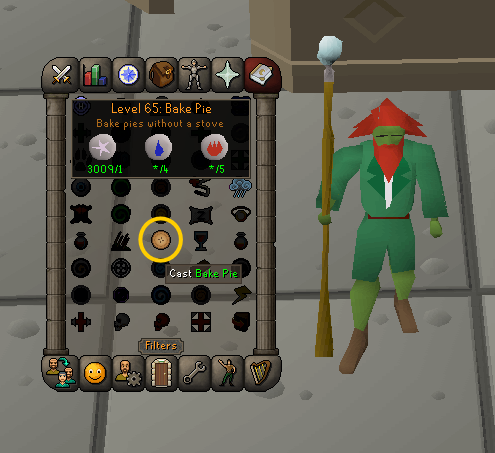 Baking pies using the Bake pie spell is a good alternative to the click-intensive method above. The Bake Pie spell is in the Lunar spellbook and can automatically cook all the pies in the inventory without the risk of burning them. It offers decent experience rates with low effort, while also giving a magic experience. The disadvantage of this method is that it is quite expensive because of the low supply and trading volumes of uncooked pies.