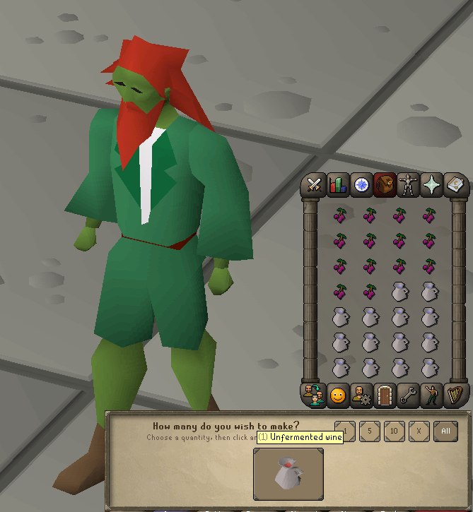 Players can make jugs of wine by simply using a jug of water on a grape; when this is done, unfermented wine forms, which turns into wine after 12 seconds and gives the player a cooking experience. If the player adds another grape to a jug of wine during this time, the 12-second timer resets. Players will get the cooking experience even if the unfermented wine is banked.