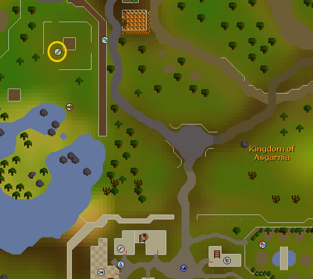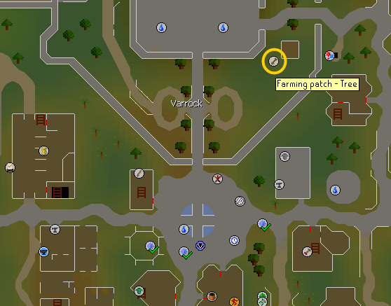 • Teleport to Varrock, run north, and then northeast to the tree patch as shown below. Plant a tree here.