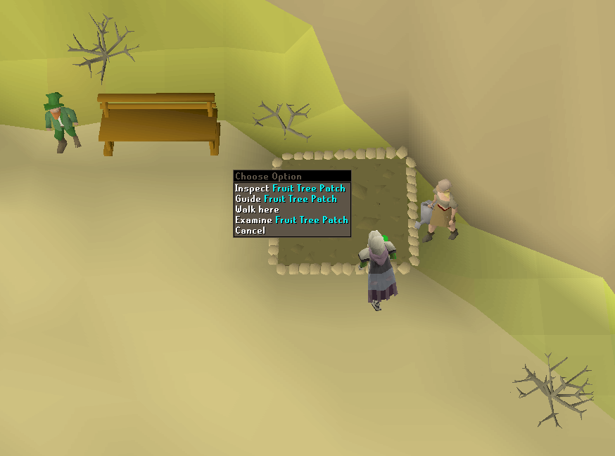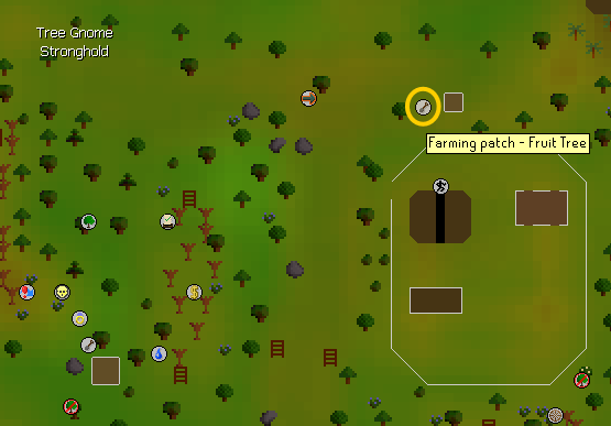 • Use the Spirit tree to teleport to the Tree Gnome Village. Run to the southwest corner and squeeze through the entrance. Use Elkoy to navigate through the maze quickly, then run southwest to the fruit tree patch. Plant a tree.